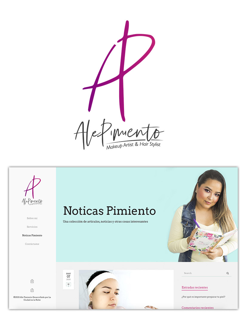 Como un encargo de la agencia La Ciudad en la Nube, trabajé el diseño de marca y el desarrollo del sitio web para la maquilladora Ale Pimiento. En este proyecto que incluyó toma de fotografías y asesoría para el inicio de su canal de Youtube y redes sociales.