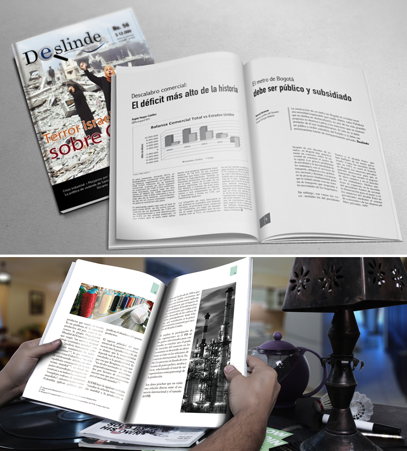 La organización Cedetrabajo, radicada en Bogotá, circula bimestralmente la revista Deslinde, en 2014 y hasta 2016 rediseñé y diagramé esta publicación, buscando mantener una línea que les permita hacer más agradable la lectura, causar impacto y recordación.